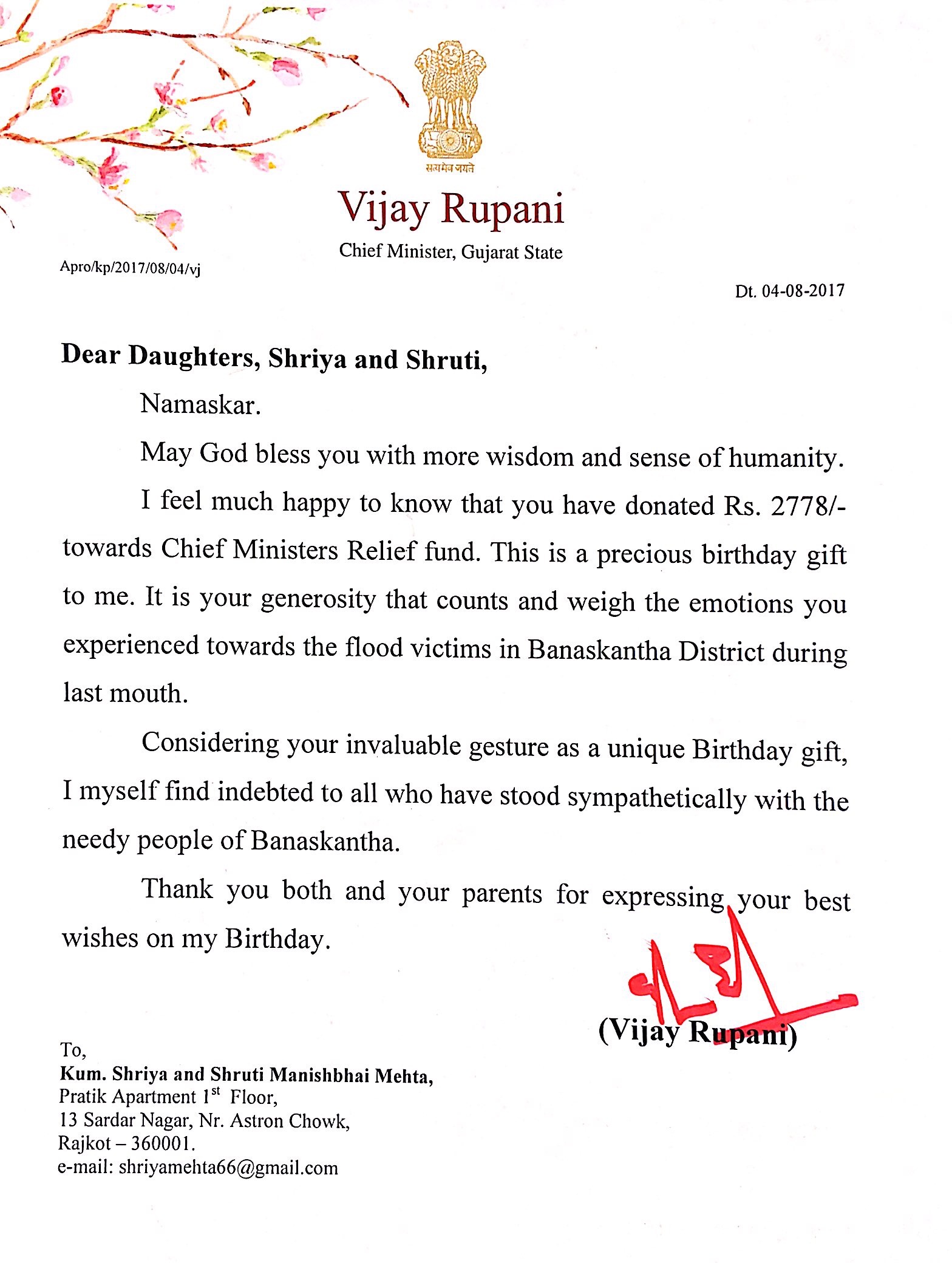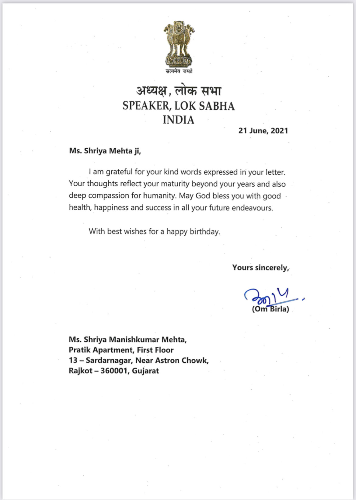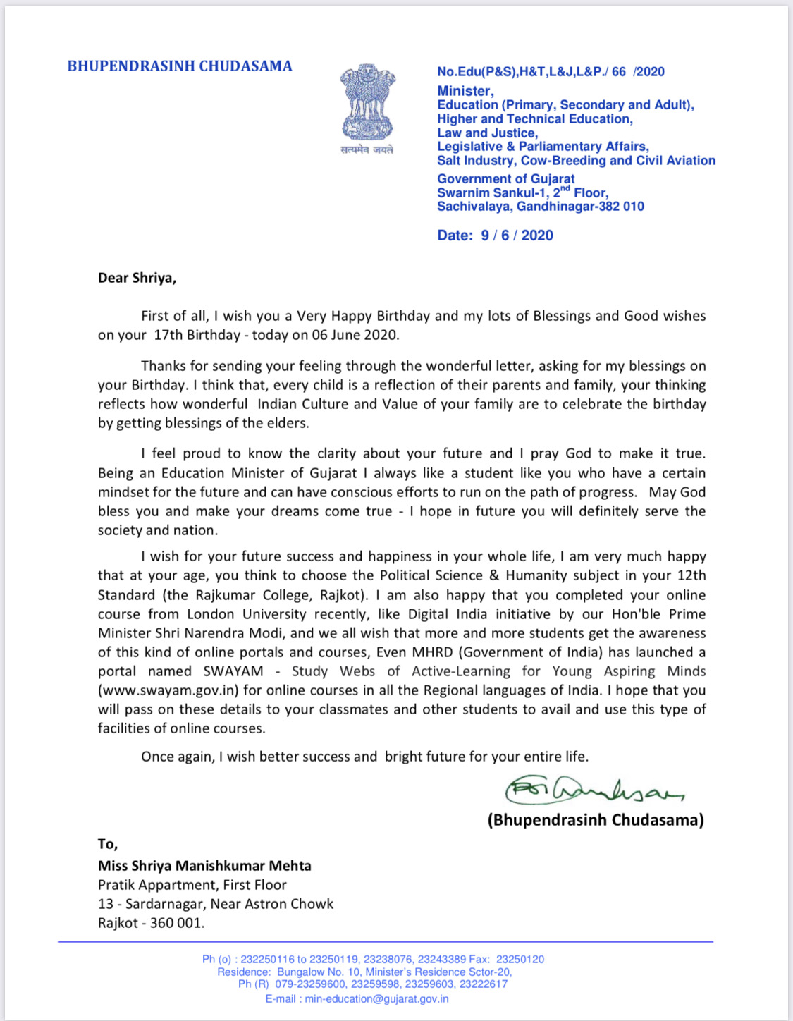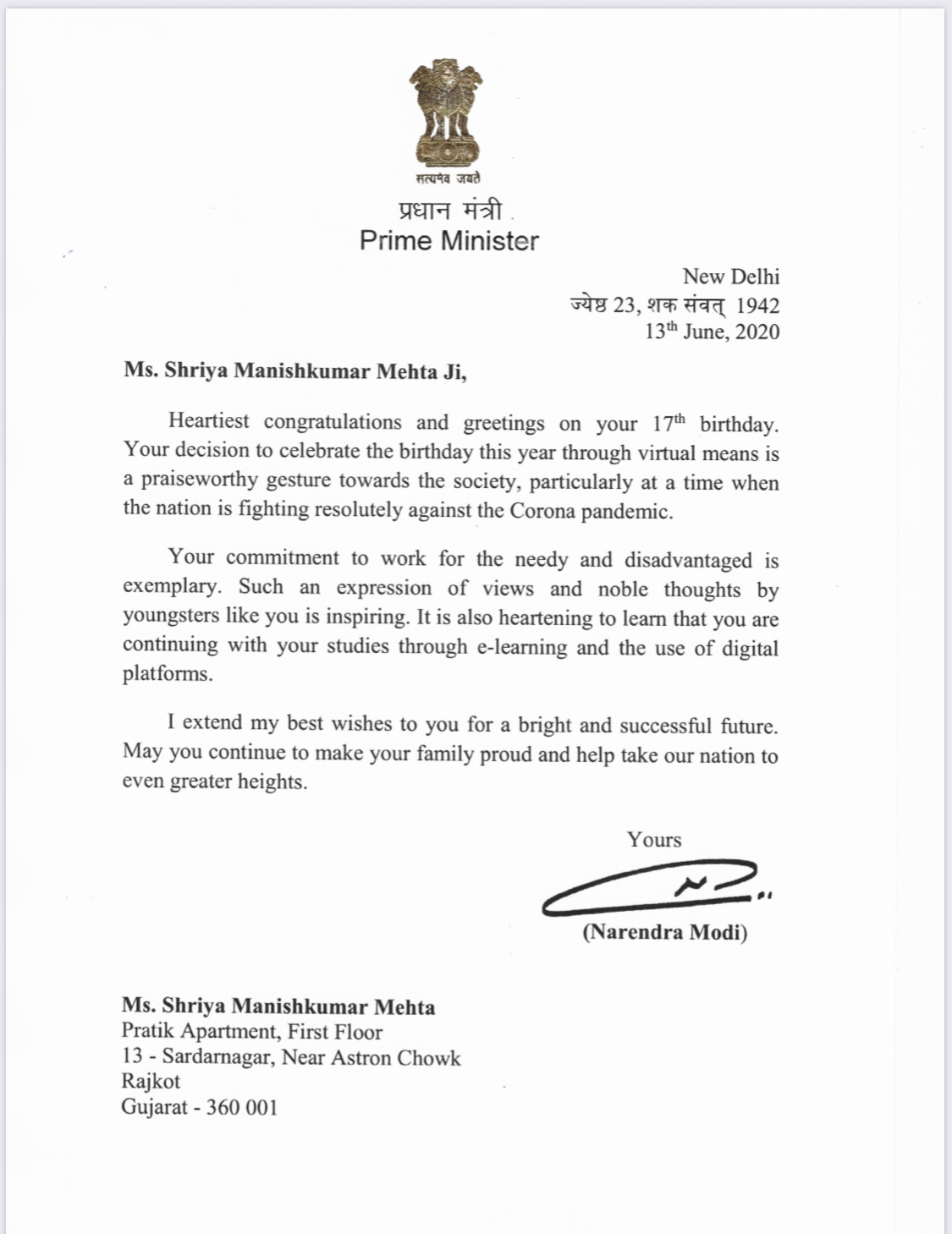 "The gesture to celebrate your 18th birthday online, sharing the happiness of your special day with the children of lesser privileged sections of the society is commendable. I am sure that you will continue to maintain a fine balance between your studies and your efforts towards conservation of ecology."
